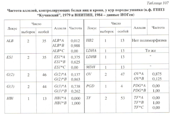 Биохимический полиморфизм. Исследования по изучению полиморфизма белков яиц и крови у ушанок были выполнены в ИОГен. Материалом служили особи к.ф. ГППЗ «Кучинский» (1979 г) и ВНИТИП (1984 г) Усредненные данные этих исследований сведены в табл 107, в которой представлена частота встречаемости аллелей 17 биохимических лоскутков. Сравнение данных таблицы а4 Приложение показывает, что концентрация аллелей локусов G(3) и ЕS1, вносящих наибольший вклад из изученных шести в дифференциацию европейских и азиатских пород, у особей породы ушанка имела противоположную тенденцию: они оказались ближе к первым по локусу G(3) и к последним по ЕS1. Оценка степени генетической изменчивости (Нт) по шести биохимическим лоскуткам обнаружила довольно высокое ее значение – 0,222. Эта величина оказалась выше, чем «мирового» генофонда, европейских и азиатских пород: 0,191, 0,170 и 0,190 соответсвенно.